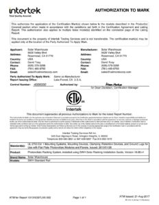 Authorization to Mark – UL2703 approved – LA-County approved